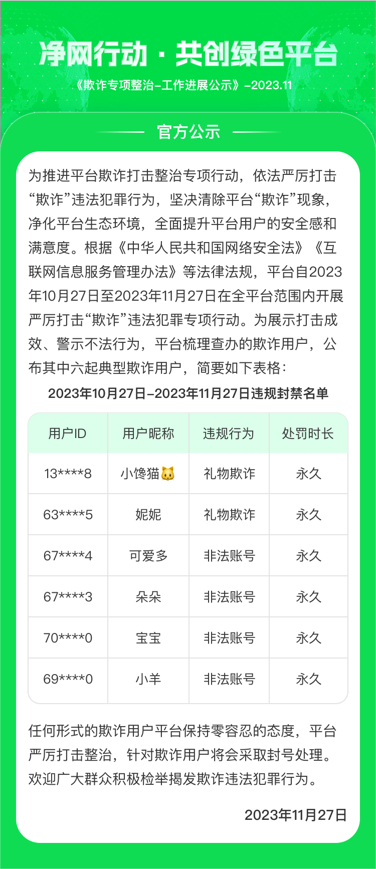 近期以来,平台注意到用户投诉反馈的欺诈行为日益严重,不仅损害了用户的合法权益,也影响了互联网行业的健康…